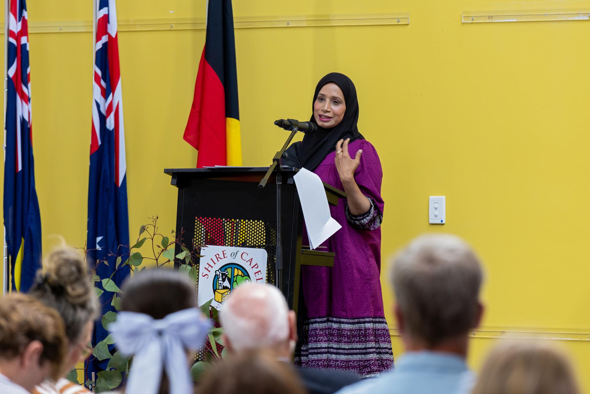 Australia Day Ambassador guest speaker Jawaria Mahmood offered her encouragement to people who are new citizens to get involved in the community such as by volunteering, finding ways to share their culture and getting out and about to experience the south west's nature and environment.