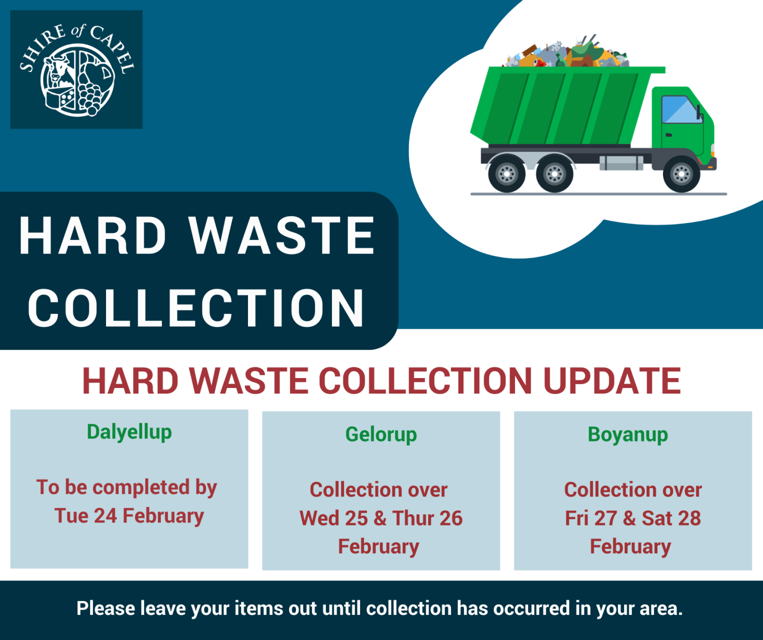 • Boyanup – collection over Friday 27 February & Saturday 28 February