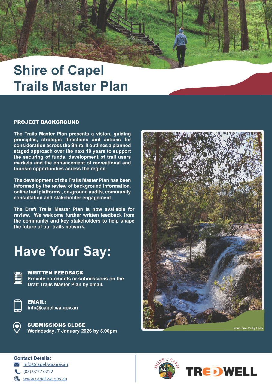 Please can you provide your feedback in writing to info@capel.wa.gov.au by Wednesday 7 January 2026, marked Capel TrailsMaster Plan feedback.