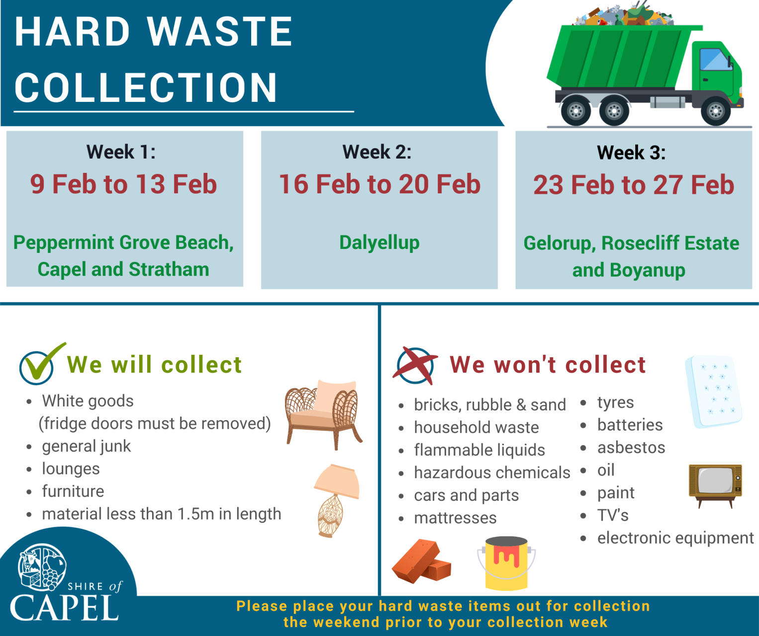 Please place your hard waste items out for collection the weekend prior to your collection week.