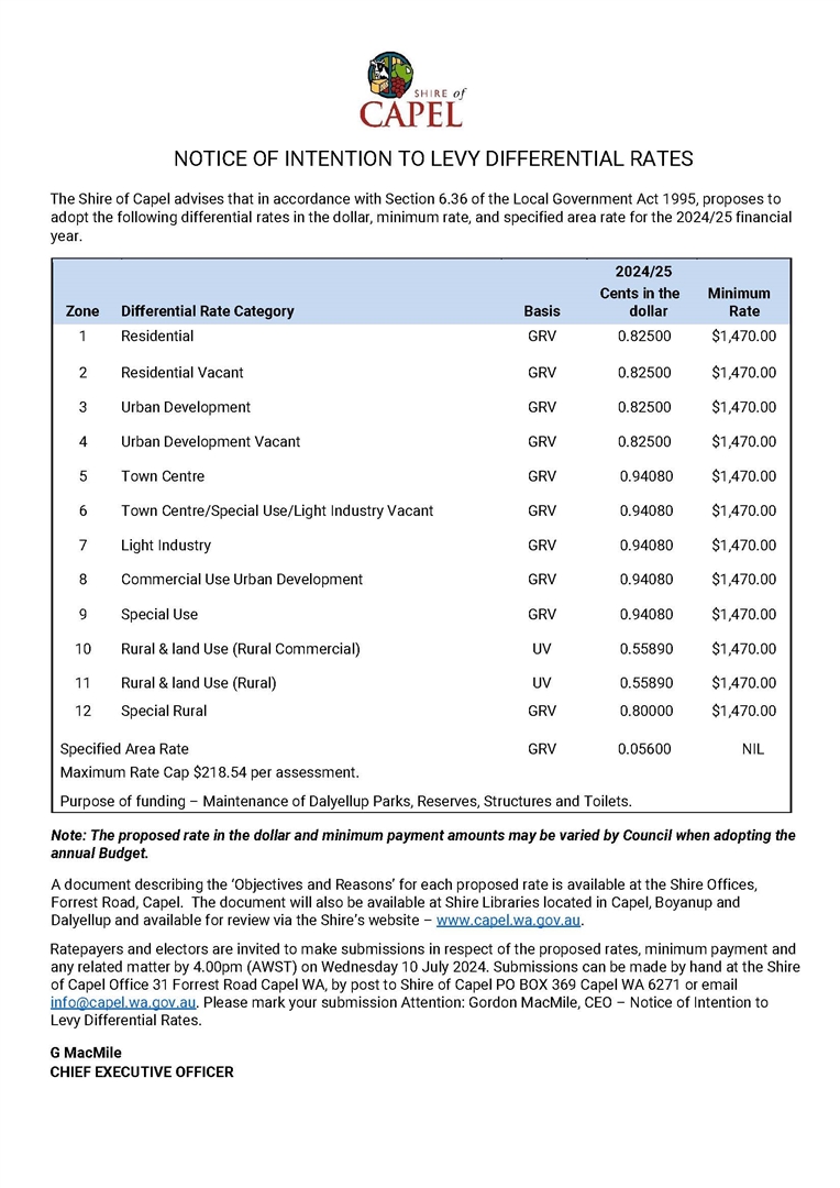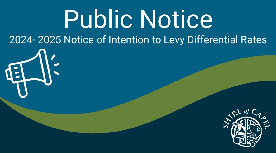 The Shire of Capel advises that in accordance with Section 6.36 of the Local Government Act 1995, proposes to adopt the following differential rates in the dollar, minimum rate and specified area rate for the 2024-25 financial year.Ratepayers and electors are invited to make submissions in respect of the proposed rates, minimum payment and any related matter by 4.00 pm (AWST) on Wednesday 10 July 2024. Submissions can be made by hand at the Shire of Capel Office 31 Forrest Road Capel WA, by post to Shire of Capel PO BOX 369 Capel WA 6271 or email info@capel.wa.gov.au. Please mark your submission Attention: Gordon MacMile, CEO – Notice of Intention to Levy Differential Rates.The Draft Annual Budget can be viewed here ➡ https://www.capel.wa.gov.au/council/strategic-corporate-planning/annual-budget.aspx
