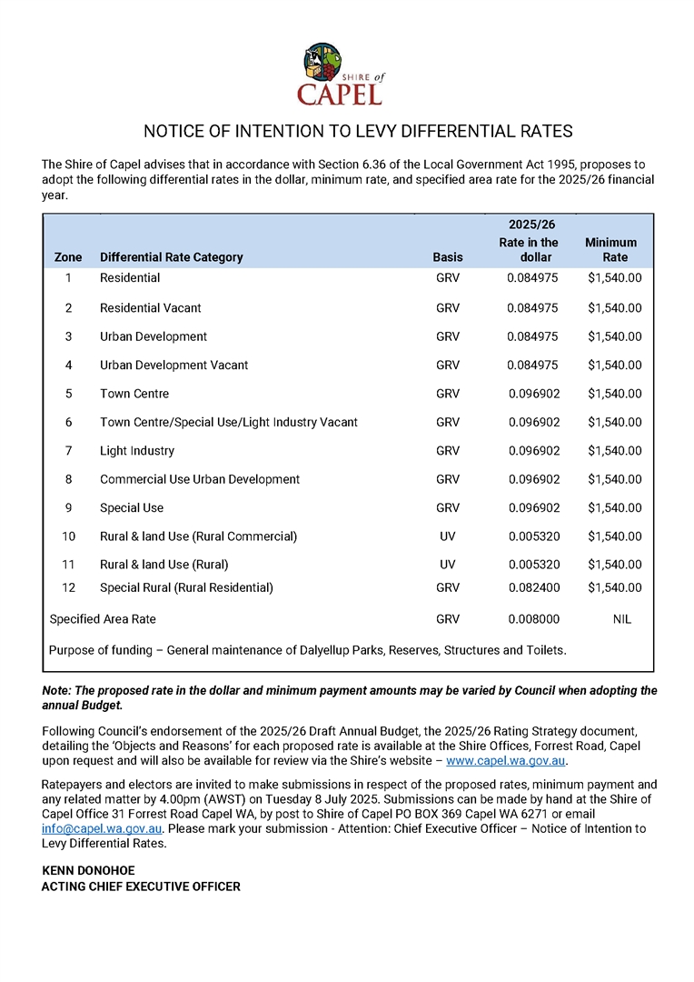 The Shire of Capel advises that in accordance with Section 6.36 of the Local Government Act 1995, proposes to adopt the following differential rates in the dollar, minimum rate, and specified area rate for the 2025/26 financial year.