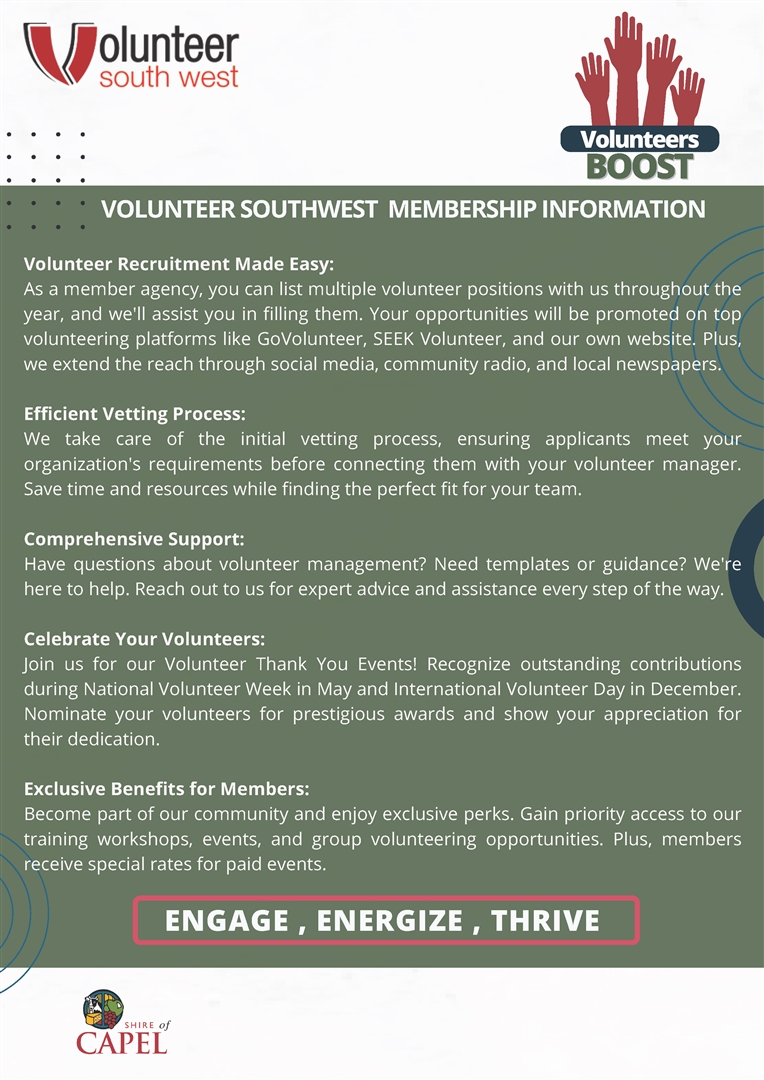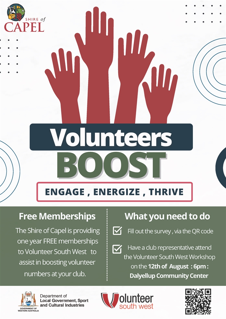 As part of the Every Club funding initiative, the Shire of Capel has partnered with Volunteers South West to offer up to 15 one-year free memberships.