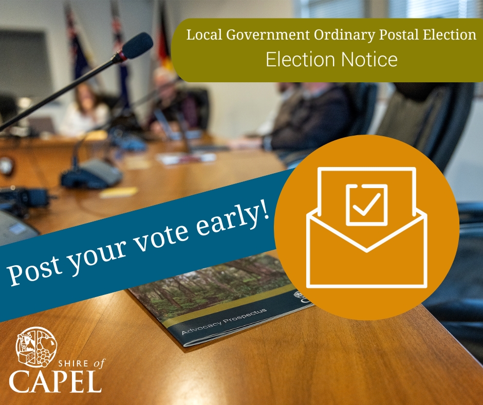 The Shire of Capel is holding an election by postal vote on Saturday, 21 October 2023 to fill vacancies in the offices of Councillors as listed below: