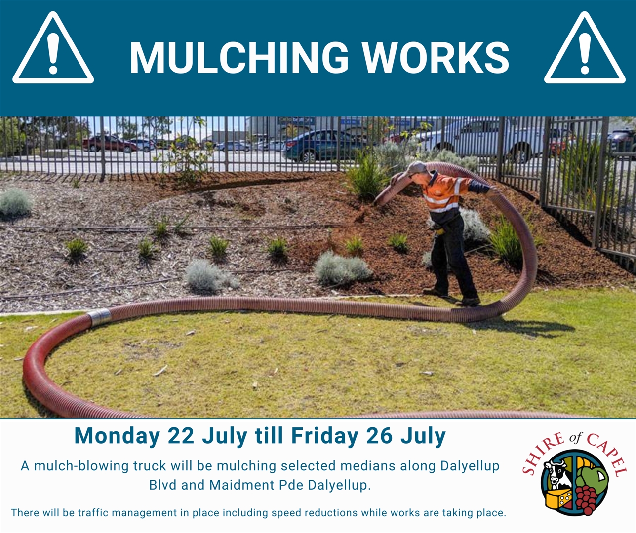 Our Parks & Gardens will be undergoing mulch-blowing works along selected medians along Dalyellup Blvd and Maidment Pde Dalyellup from Monday 22 July until Friday 26 July.