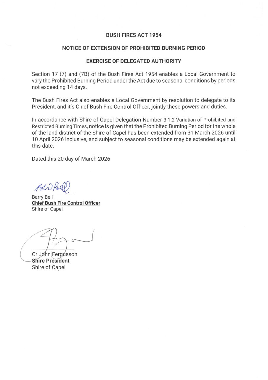 Notice is given that the PROHIBITED Burning Period for the whole of the land district of the Shire of Capel has been extended from 31 March until 10 April 2026 inclusive, and subject to seasonal conditions may be extended again at this date.