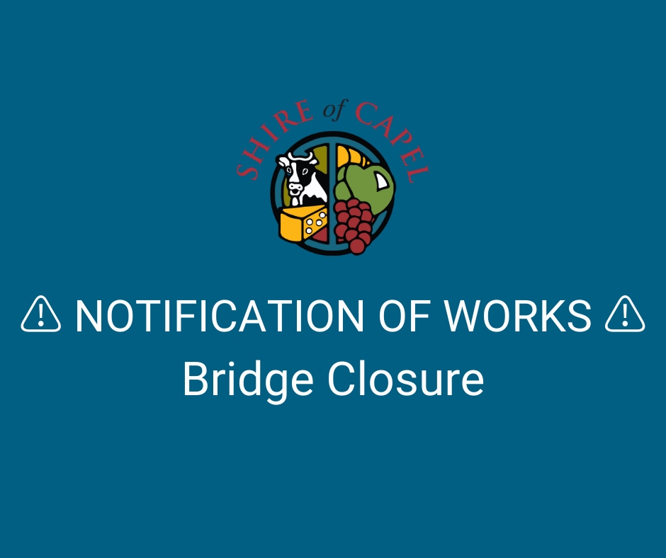 The Shire of Capel thanks you for your patience whilst bridge upgrade works are carried out. Should you have any enquiries or concerns regarding the works, please do not hesitate to contact Water Corporation 13 13 75 (24-hour fault line).