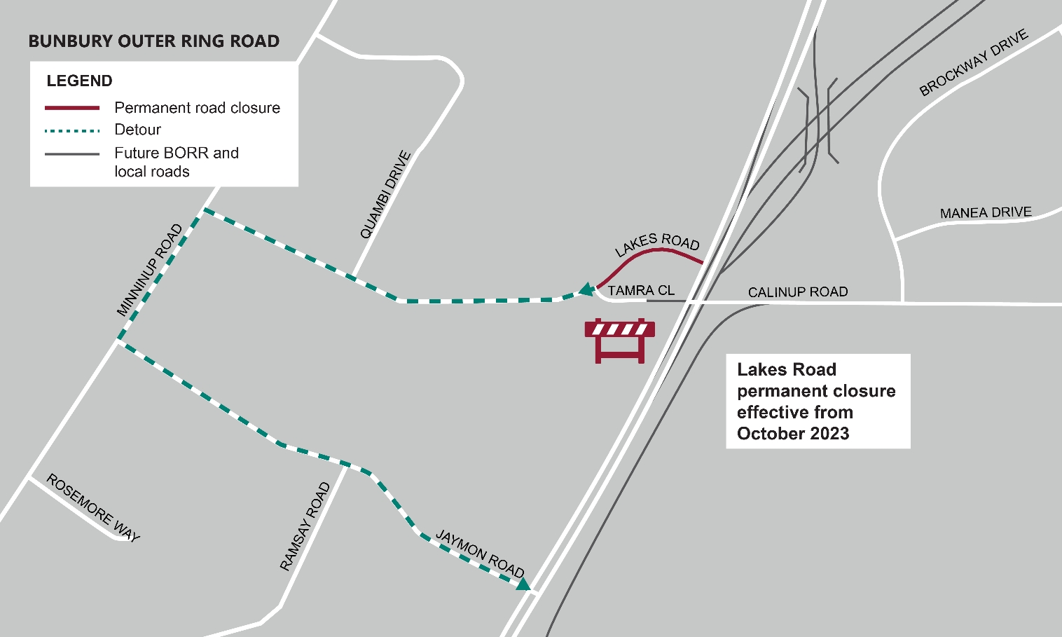From Tuesday 10 October 2023, Lakes Road will be permanently closed between Bussell Highway and Tamra Close. This closure will enable further construction of the Bunbury Outer Ring Road and new local road connections.
