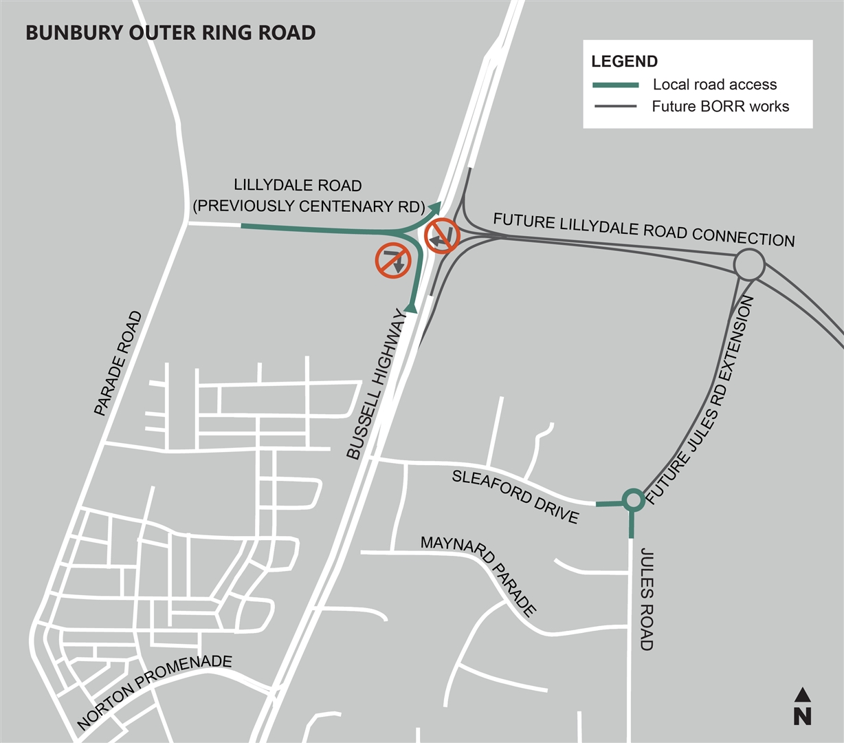 From Thursday, 1 August 2024 Lillydale Road west of Bussell Highway will reopen providing left in, left out access to Bussell Highway.