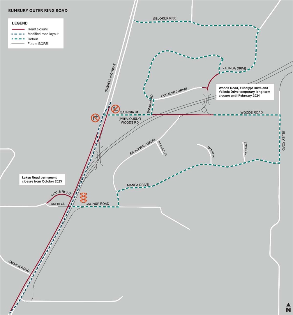 Banksia Road (previously Woods Road) will change to a left in, left out arrangement. Bussell Highway northbound traffic will need to use Gelorup Rise.