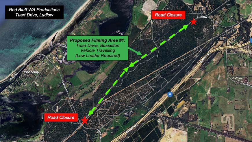 Temporary road closure and traffic diversion that will be implemented along Tuart Drive, Ludlow, between Layman Road and Ludlow Road North, to facilitate the filming of driving scenes for a television series.