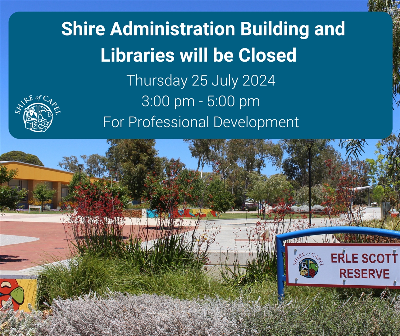 This Thursday 25 July, Capel Administration Building and Libraries will be closing at 3:00 pm for staff professional development.