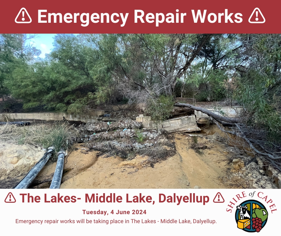 Please be informed that emergency repair work will be conducted in The Lakes - Middle Lake - Dalyellup starting Tuesday 4 June 2024. These repairs are crucial to ensure the safety and functionality of the area.