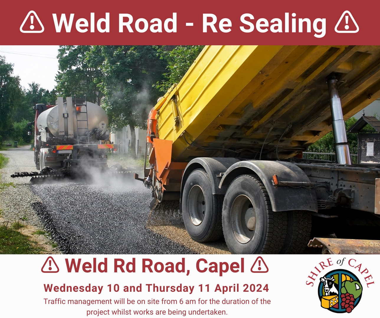 The Shire of Capel will be conducting Re-Sealing works on Weld Road on ๐ช๐ฒ๐ฑ๐ป๐ฒ๐๐ฑ๐ฎ๐ ๐ญ๐ฌ๐๐ต ๐ฎ๐ป๐ฑ ๐ง๐ต๐๐ฟ๐๐ฑ๐ฎ๐ ๐ญ๐ญ๐๐ต ๐๐ฝ๐ฟ๐ถ๐น ๐ฎ๐ฌ๐ฎ๐ฐ.
